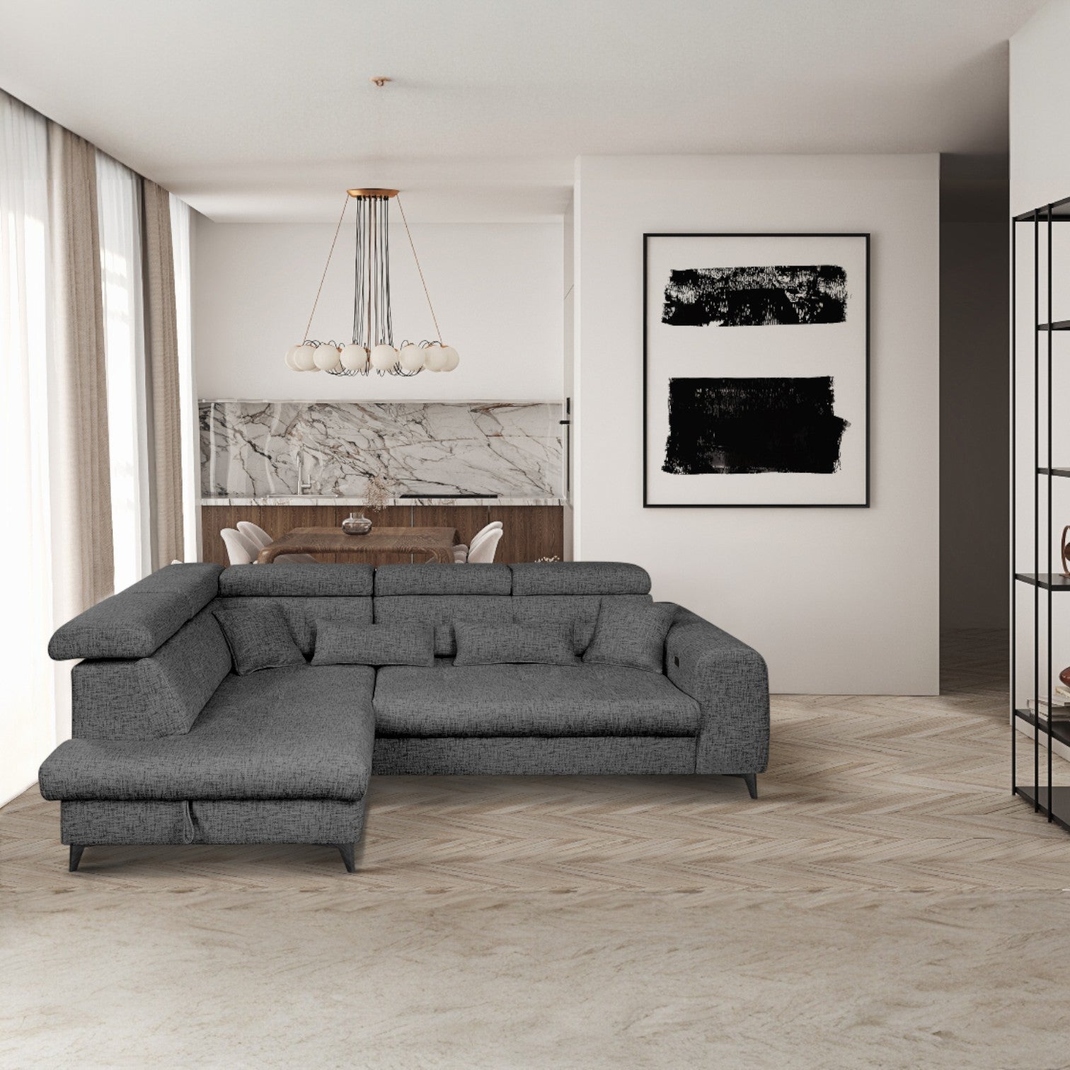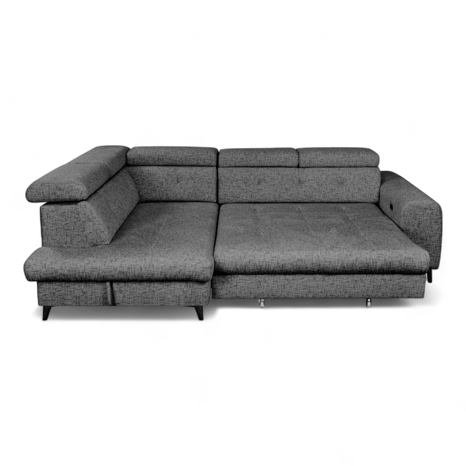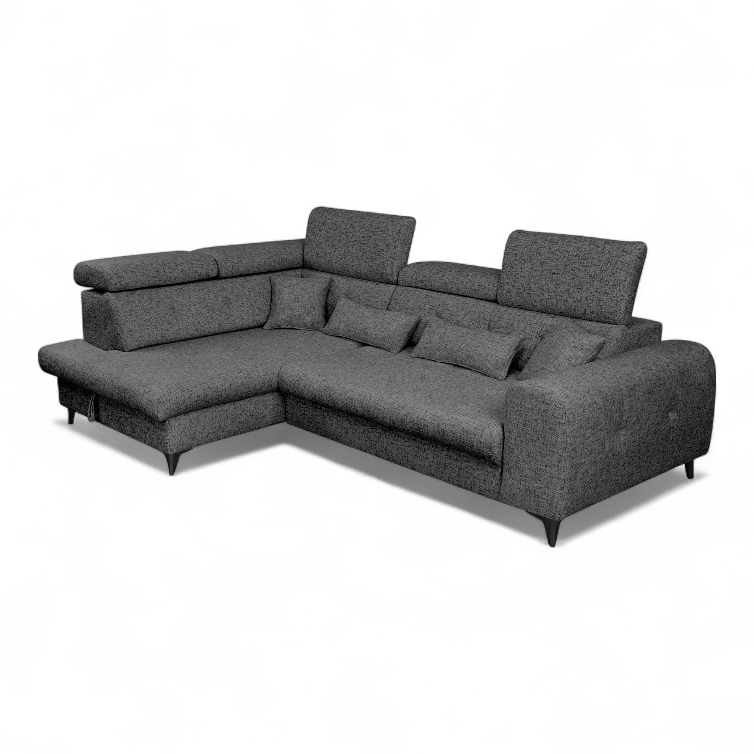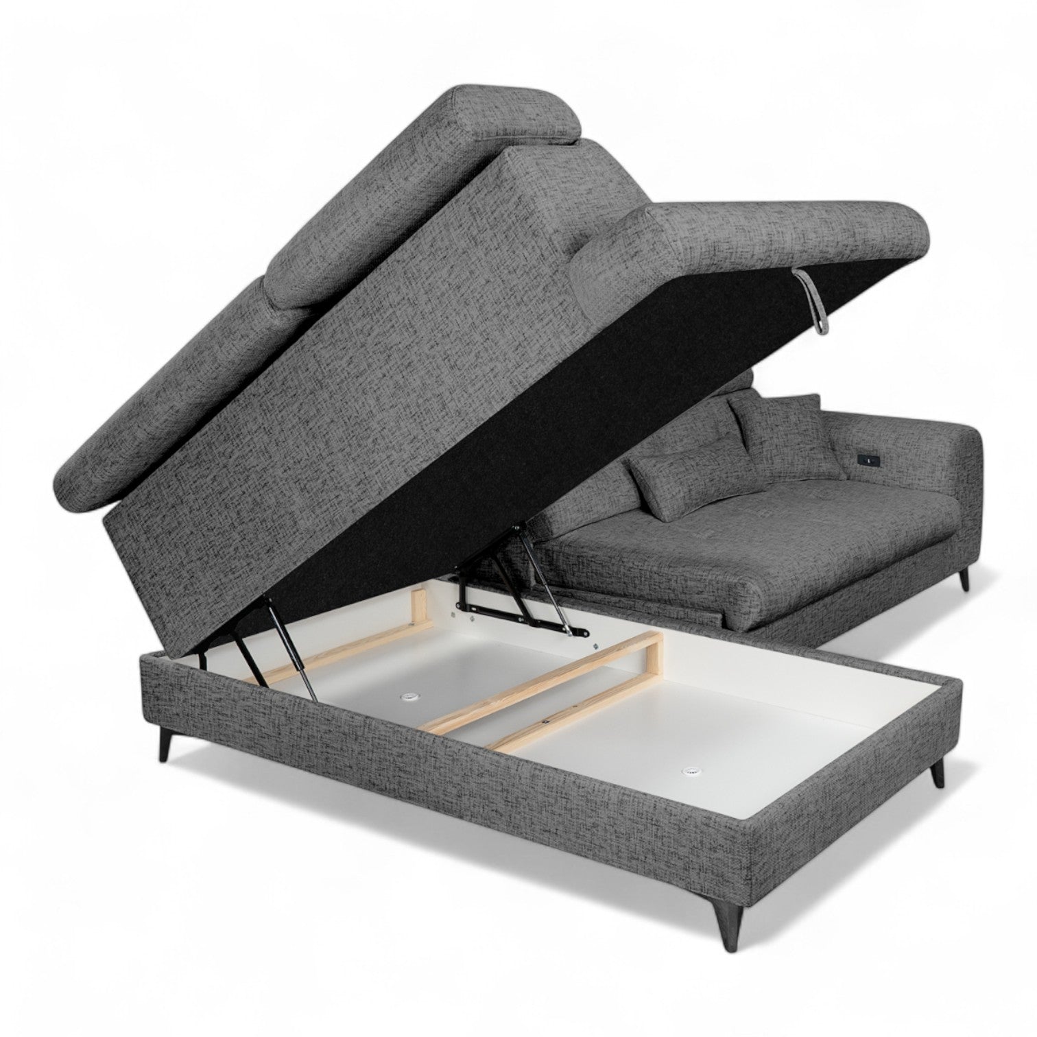 De individuelt justerbare nakkestøttene gir personlig støtte, enten du ønsker å sitte oppreist og lese eller lene deg tilbake og slappe av. Et romslig oppbevaringsrom gir praktisk plass til puter, pledd eller sengetøy, og bidrar til å holde stuen ryddig. De elegante metallbena gir sofaen et lett og moderne uttrykk, samtidig som de sikrer stabilitet.