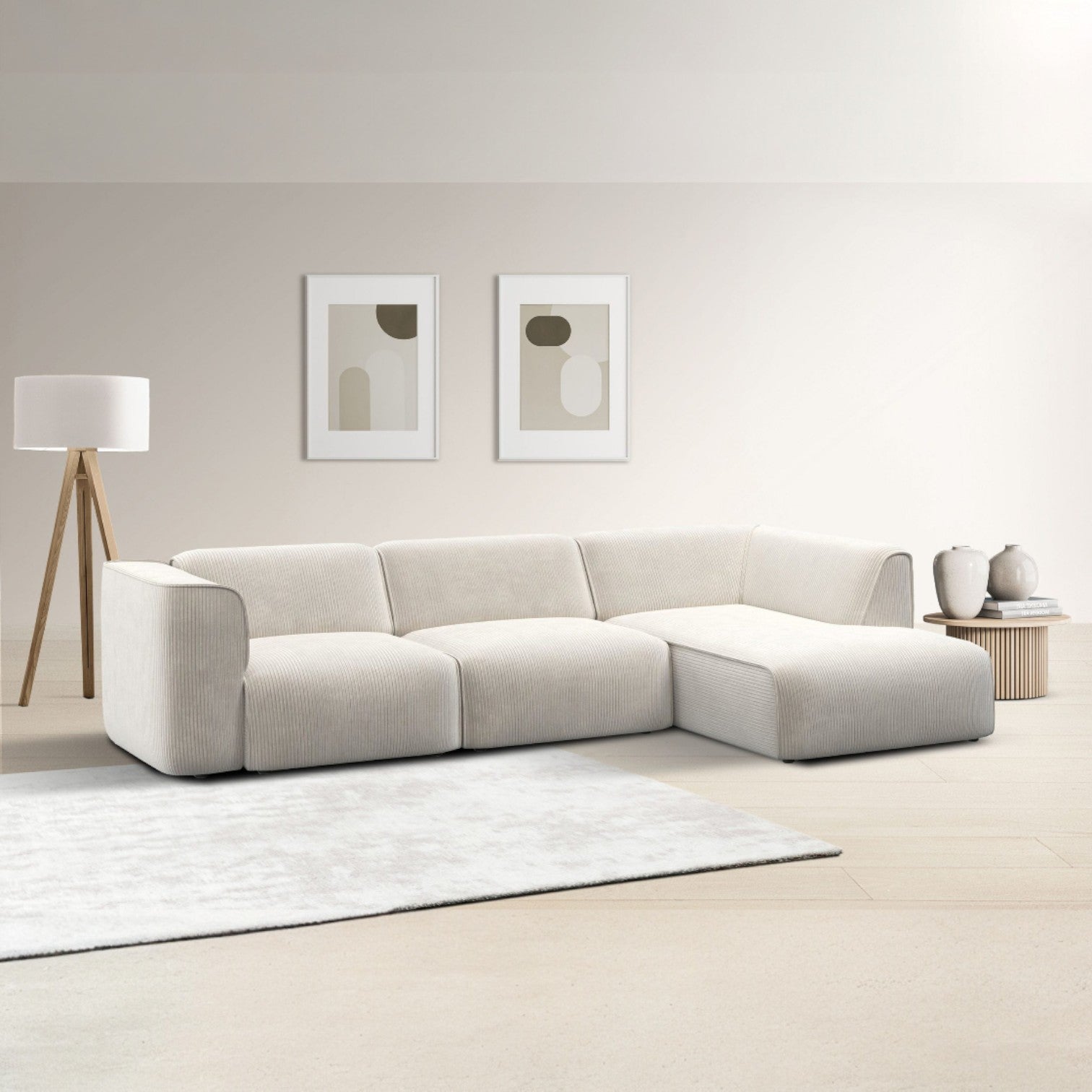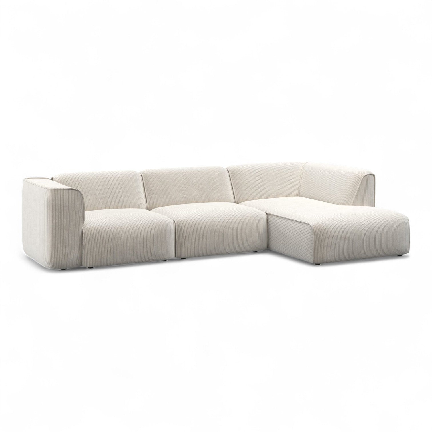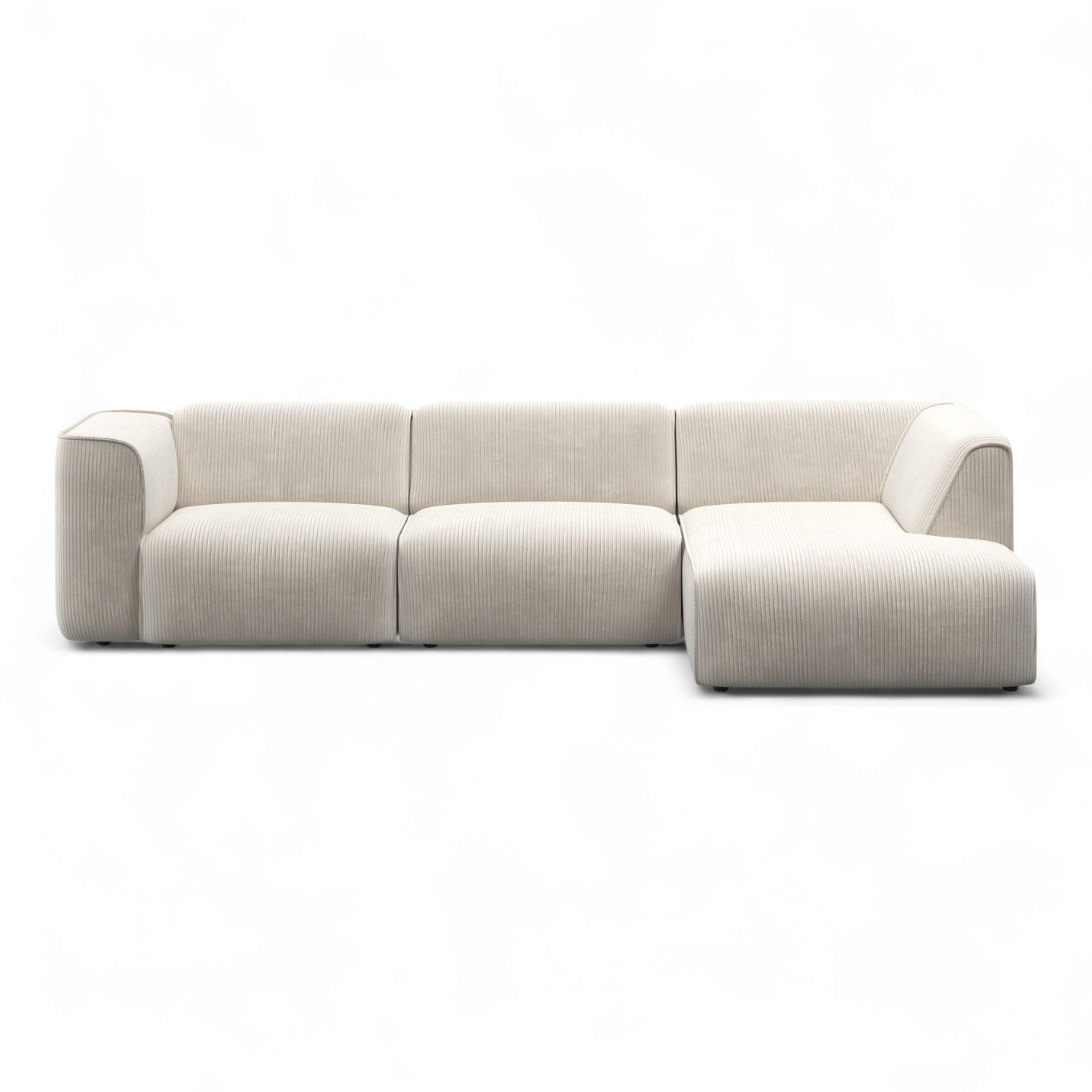 Sofa med sjeselong Madea Poso 100 er en elegant hjørnesofa med høyrevendt sjeselong som gir rommet en myk og moderne atmosfære. Trukket i det luksuriøse fløyelsstoffet Poso 100 i en vakker beige tone, tilfører sofaen varme og tidløs eleganse til enhver stue.