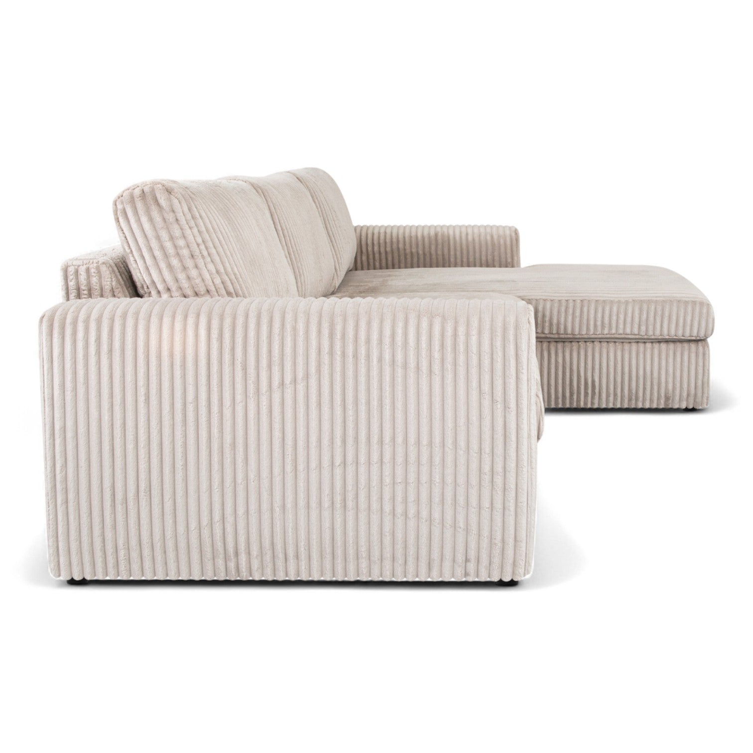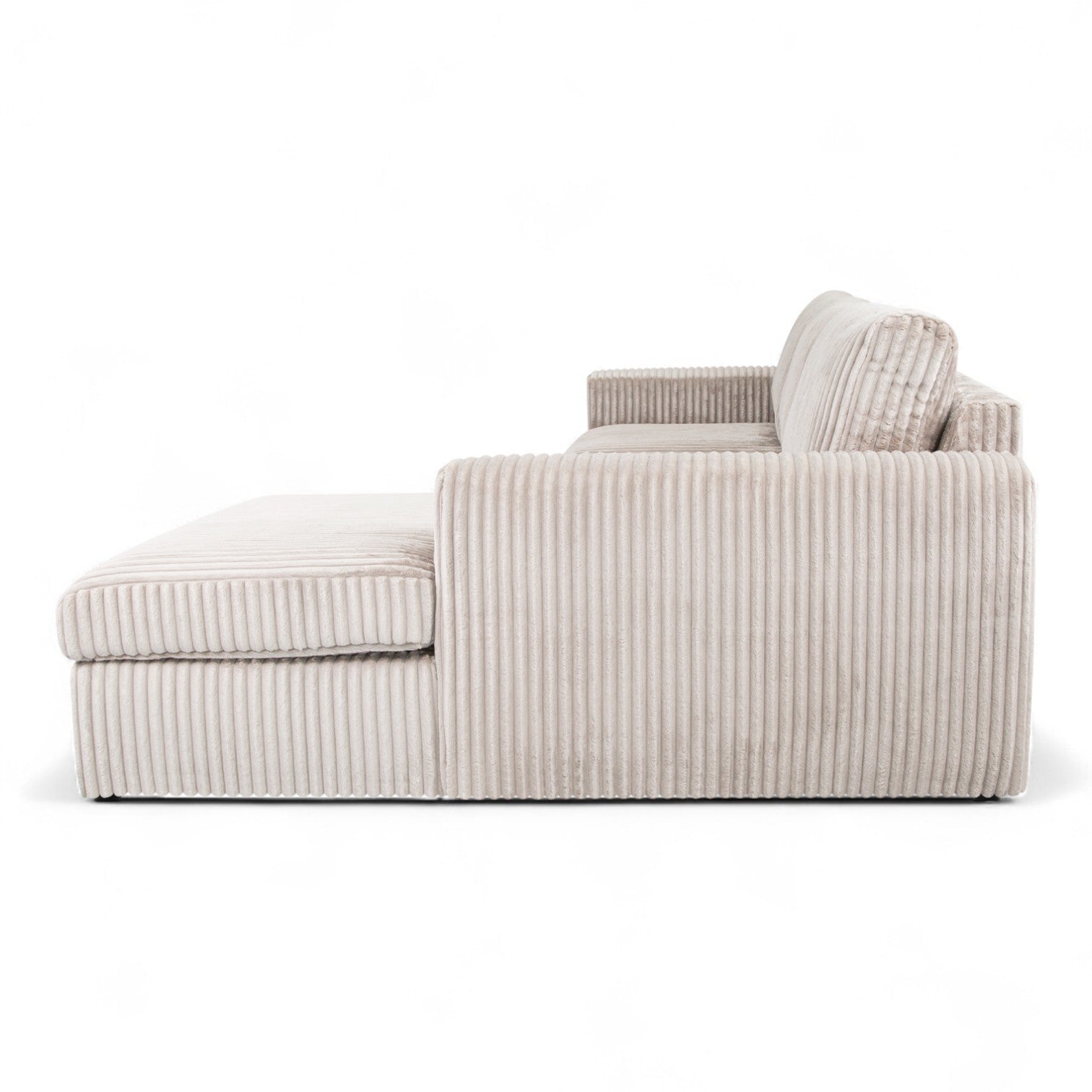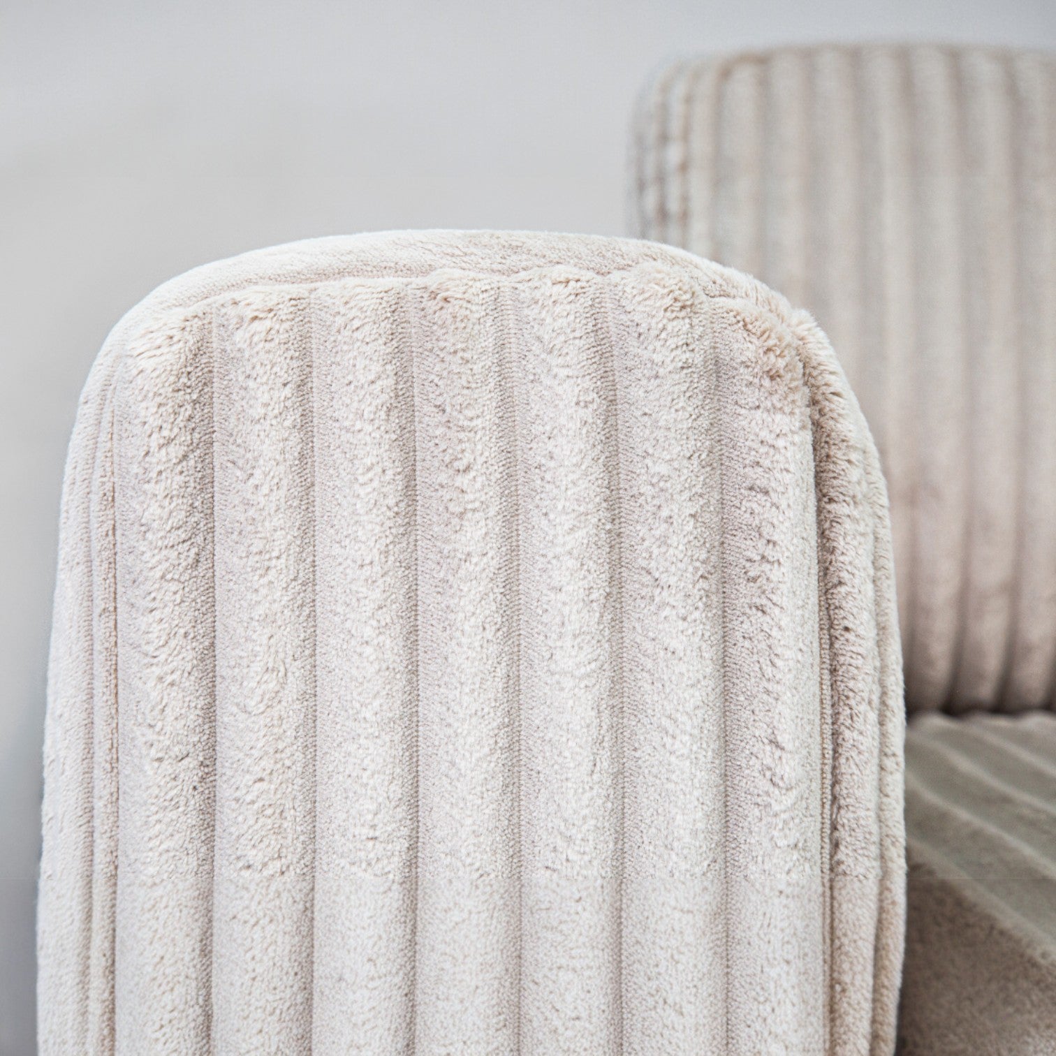 Premium Vello 22 kord - bygget for livet: Pier er trukket i det robuste Vello 30 strikkestoffet som imponerer med sin unike søylestruktur og eksepsjonelle holdbarhet. Dette varpstrikkede materialet med karakteristiske brede striper tilpasser seg perfekt til møblets form takket være sin naturlige elastisitet. Det myke fiberdekselet kombinerer luksuriøs følelse med praktisk funksjonalitet - perfekt for familier som lever livet fullt ut.