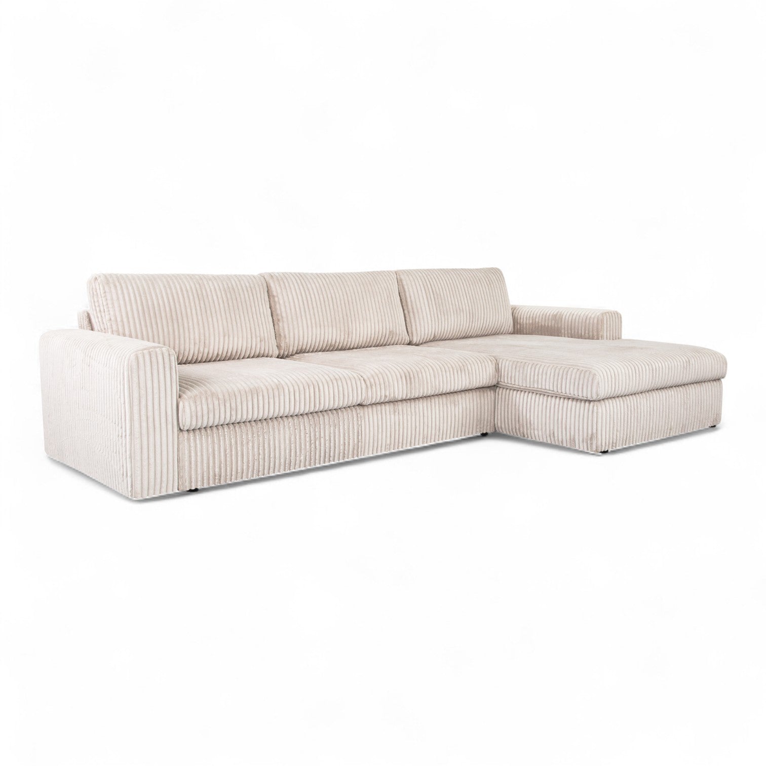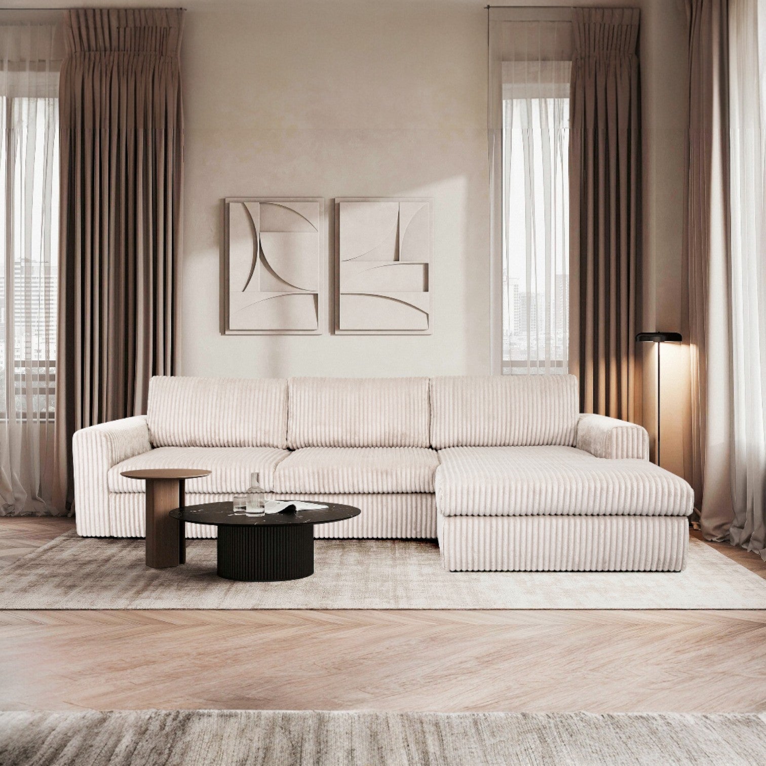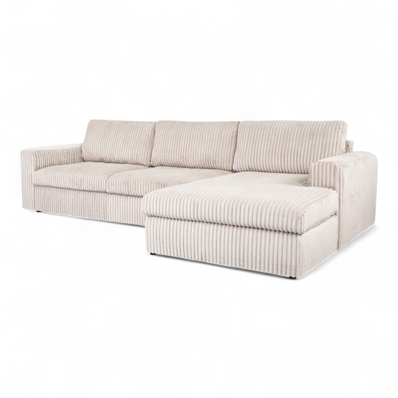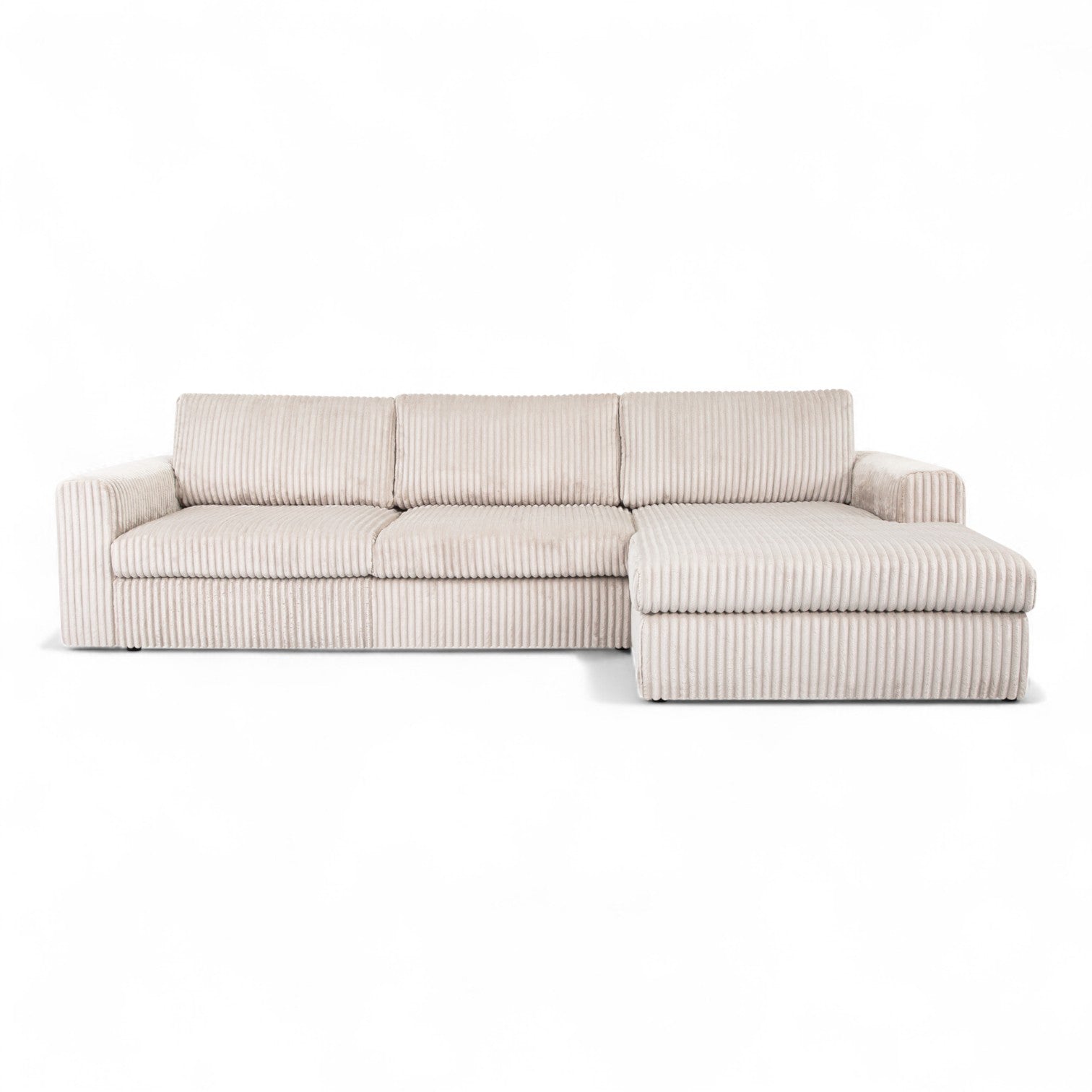 Premium Vello 22 kord - bygget for livet: Pier er trukket i det robuste Vello 30 strikkestoffet som imponerer med sin unike søylestruktur og eksepsjonelle holdbarhet. Dette varpstrikkede materialet med karakteristiske brede striper tilpasser seg perfekt til møblets form takket være sin naturlige elastisitet. Det myke fiberdekselet kombinerer luksuriøs følelse med praktisk funksjonalitet - perfekt for familier som lever livet fullt ut.