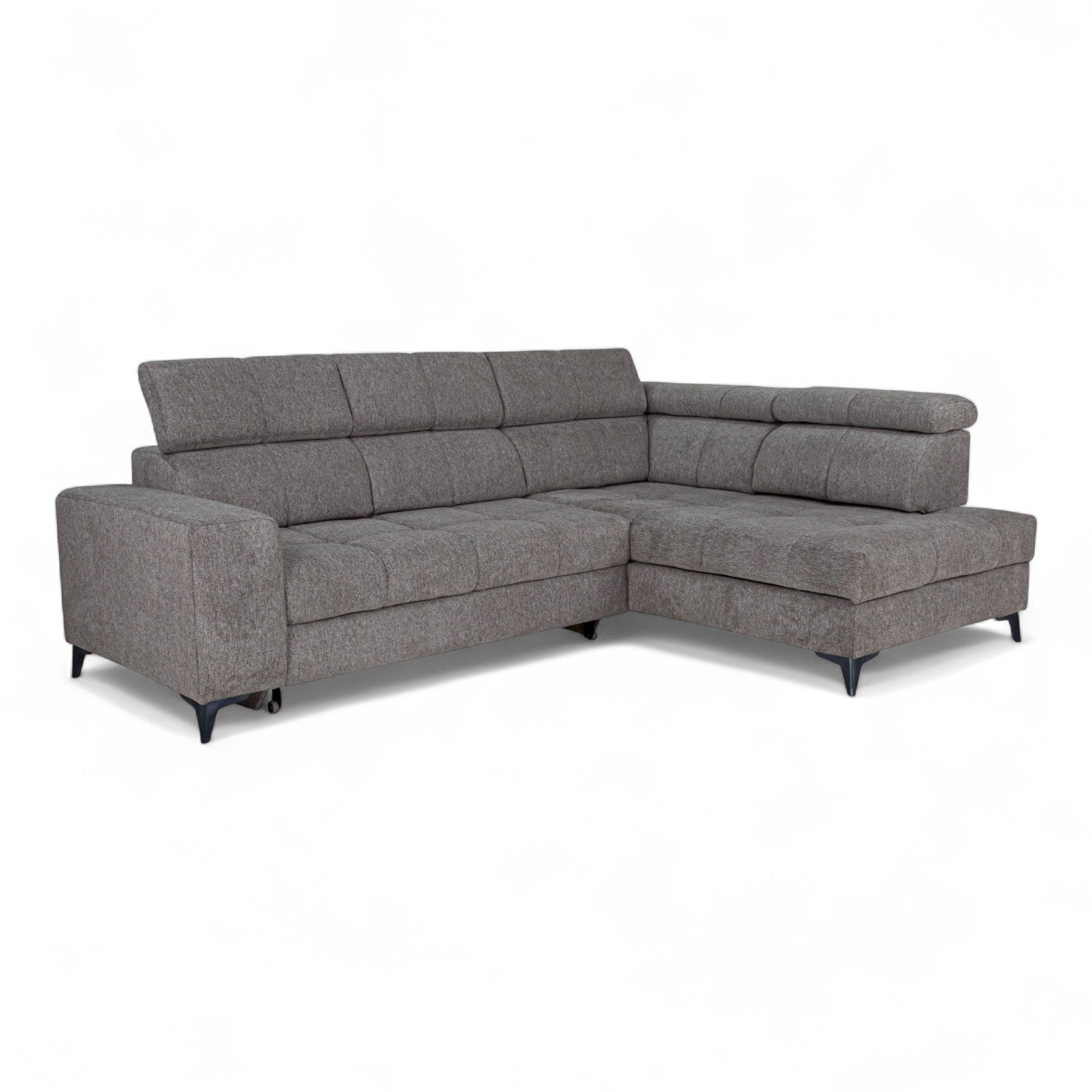 Med Hjørnesofa SAHARA får du et møbel som dekker alle behov. Sovefunksjonen er perfekt når du har gjester, og de justerbare nakkestøttene lar deg finne den ideelle posisjonen for en filmkveld. Den store oppbevaringsboksen hjelper deg å holde stuen ryddig og organisert. Det unike Glow-stoffet har en tykk veving som skaper en fascinerende melange-effekt, og gir sofaen dybde og karakter. Dette er ikke bare en sofa – det er en investering i komfort og stil for hjemmet ditt.