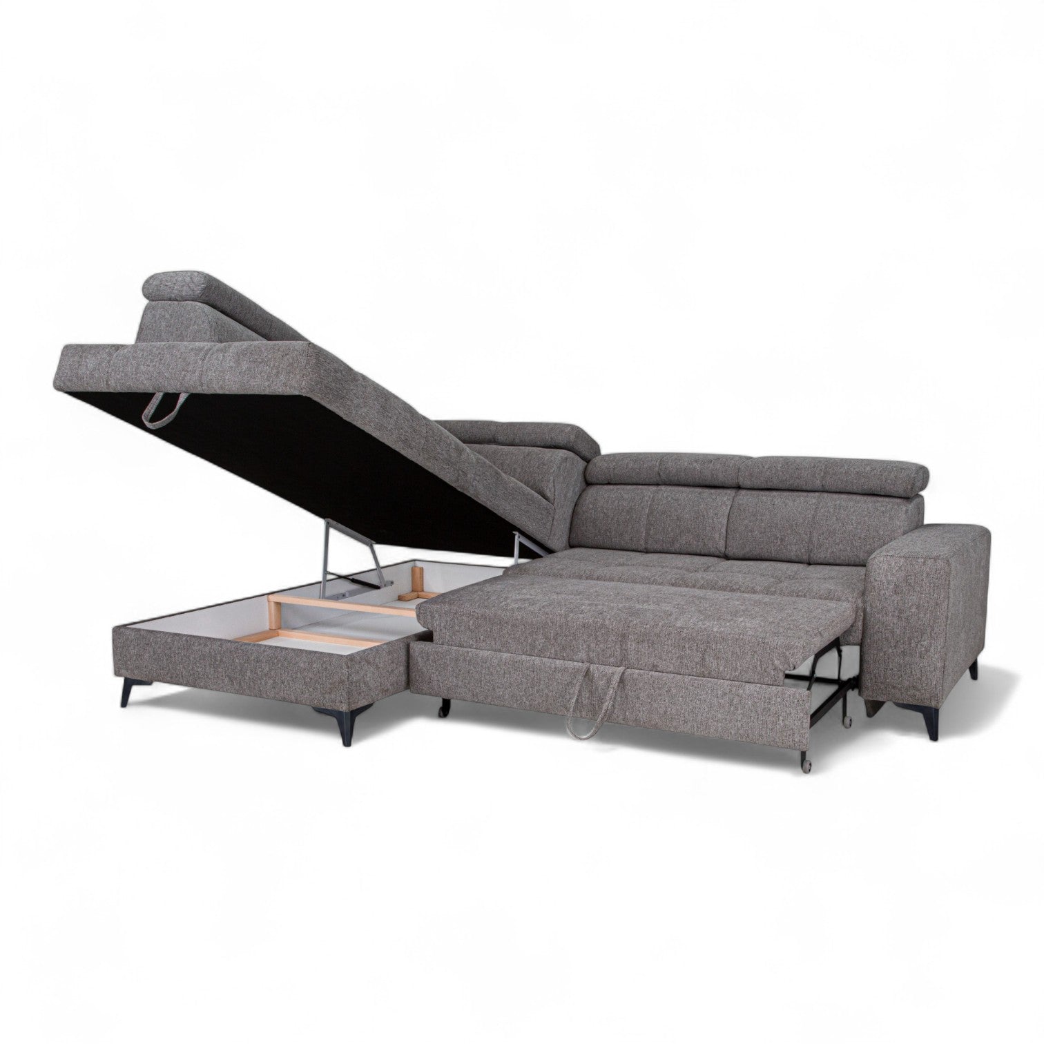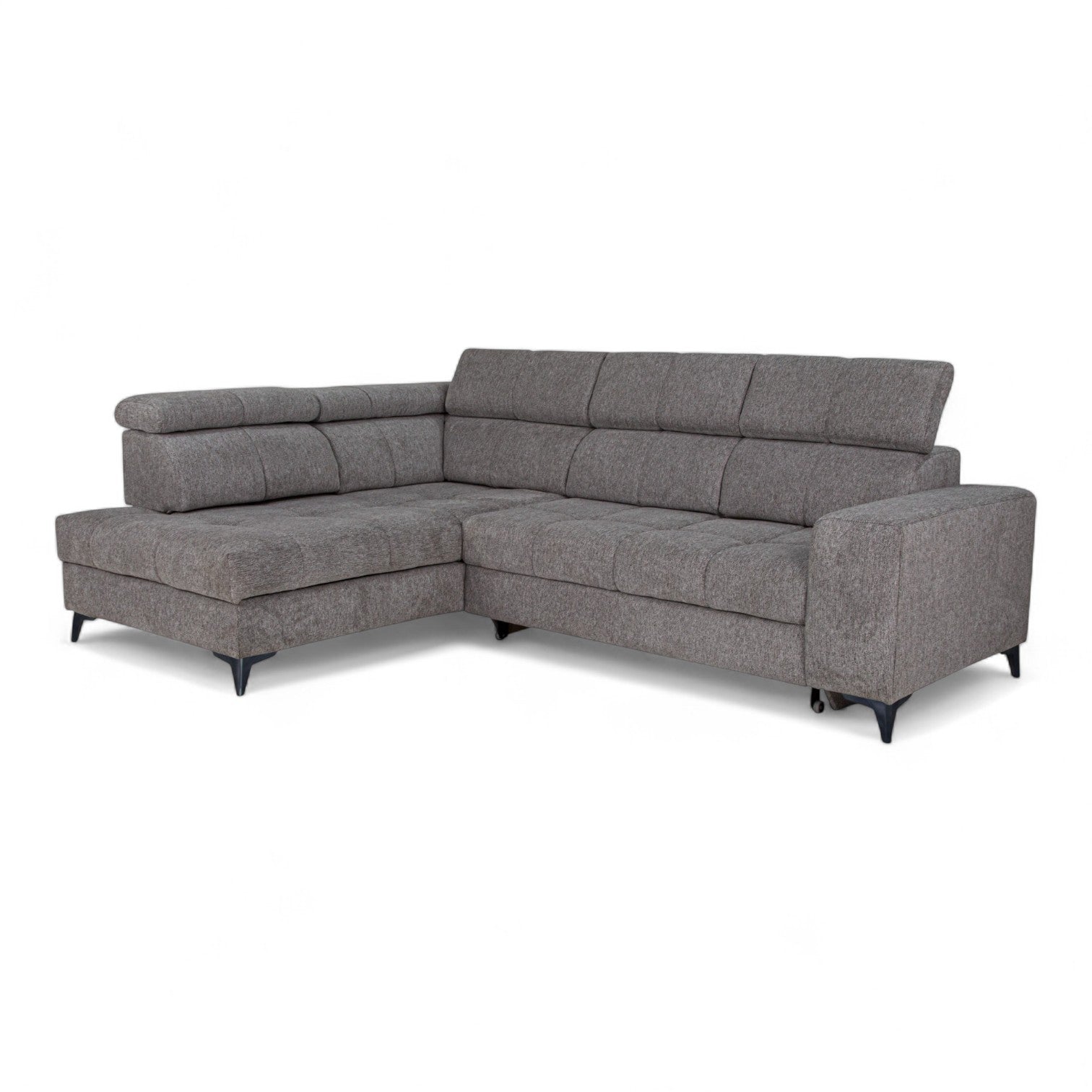 Med Hjørnesofa SAHARA får du et møbel som dekker alle behov. Sovefunksjonen er perfekt når du har gjester, og de justerbare nakkestøttene lar deg finne den ideelle posisjonen for en filmkveld. Den store oppbevaringsboksen hjelper deg å holde stuen ryddig og organisert. Det unike Glow-stoffet har en tykk veving som skaper en fascinerende melange-effekt, og gir sofaen dybde og karakter. Dette er ikke bare en sofa – det er en investering i komfort og stil for hjemmet ditt.