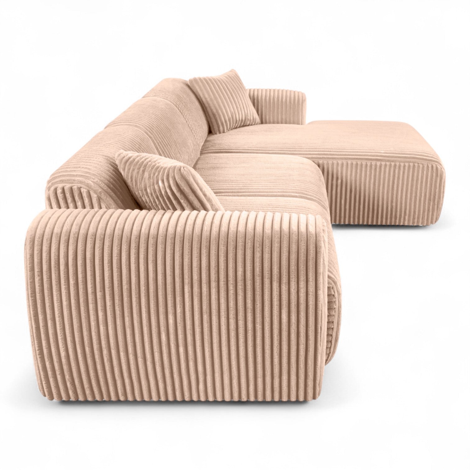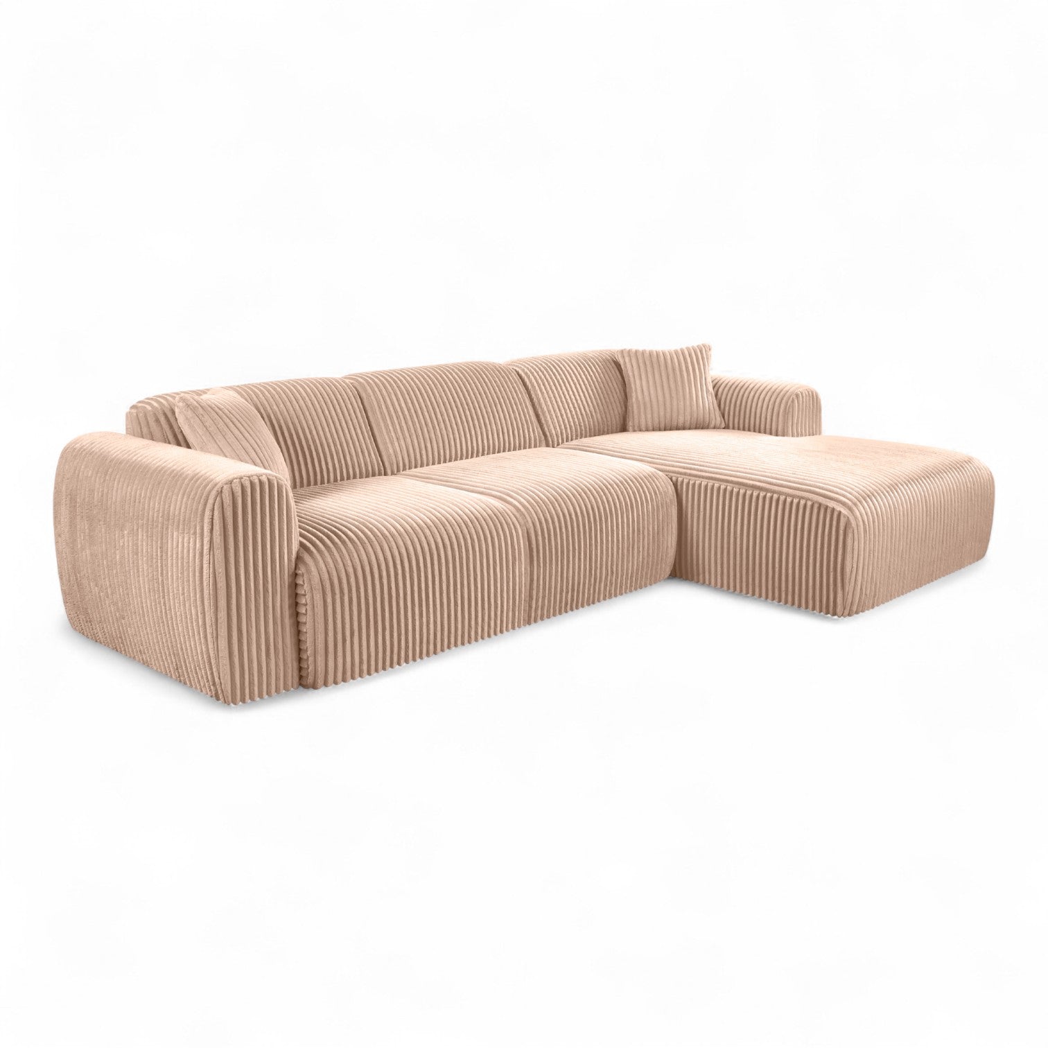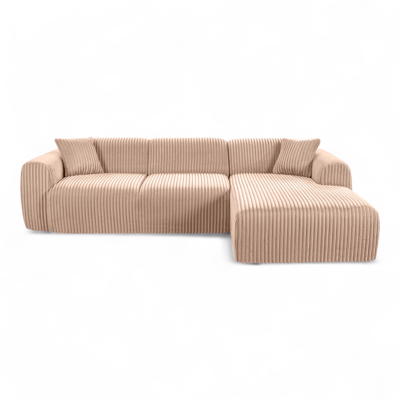 Med en romslig sjeselong og generøse mål får hele familien god plass. Seteputene har en kvalitetsrik kaldskum-kombinasjon som gir en myk, men støttende sittekomfort som holder seg over tid – uten å synke eller miste formen. Sofaen er trukket i den myke kordfløyelen VELO 30, et stoff som er ekstremt koselig, behagelig å ta på og inviterer til ekte avslapning.