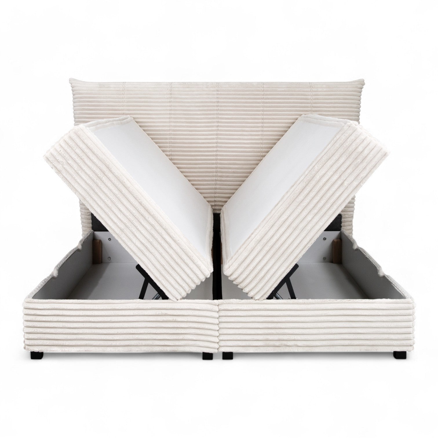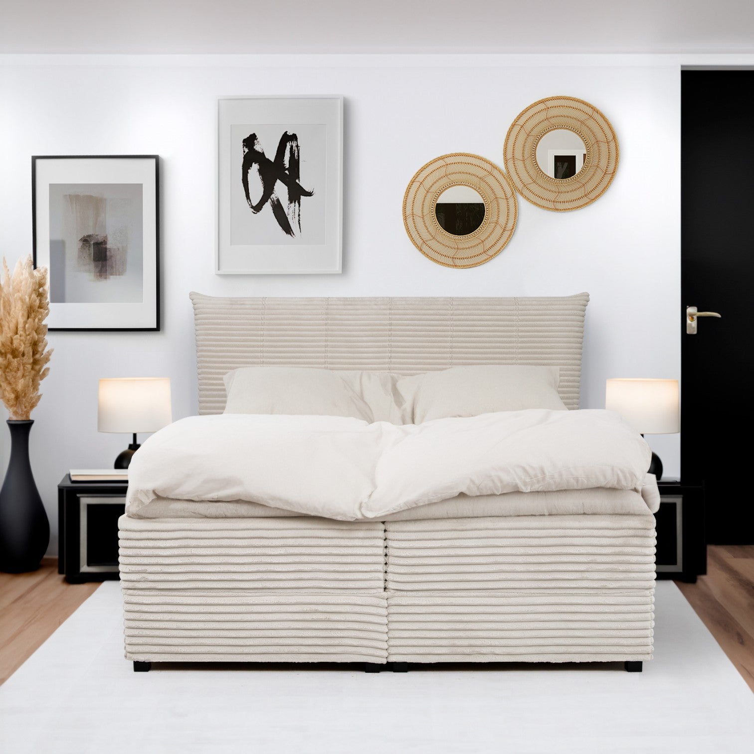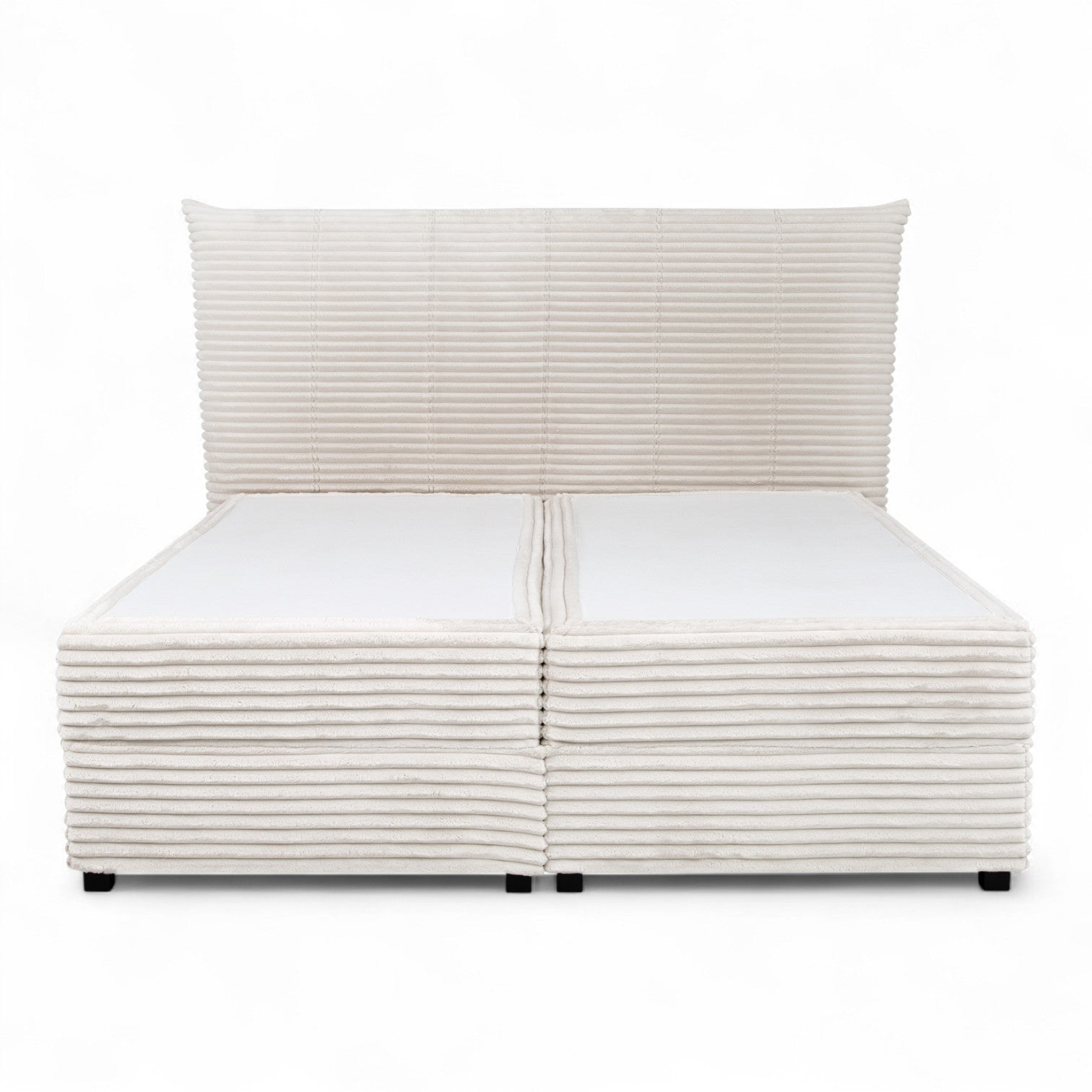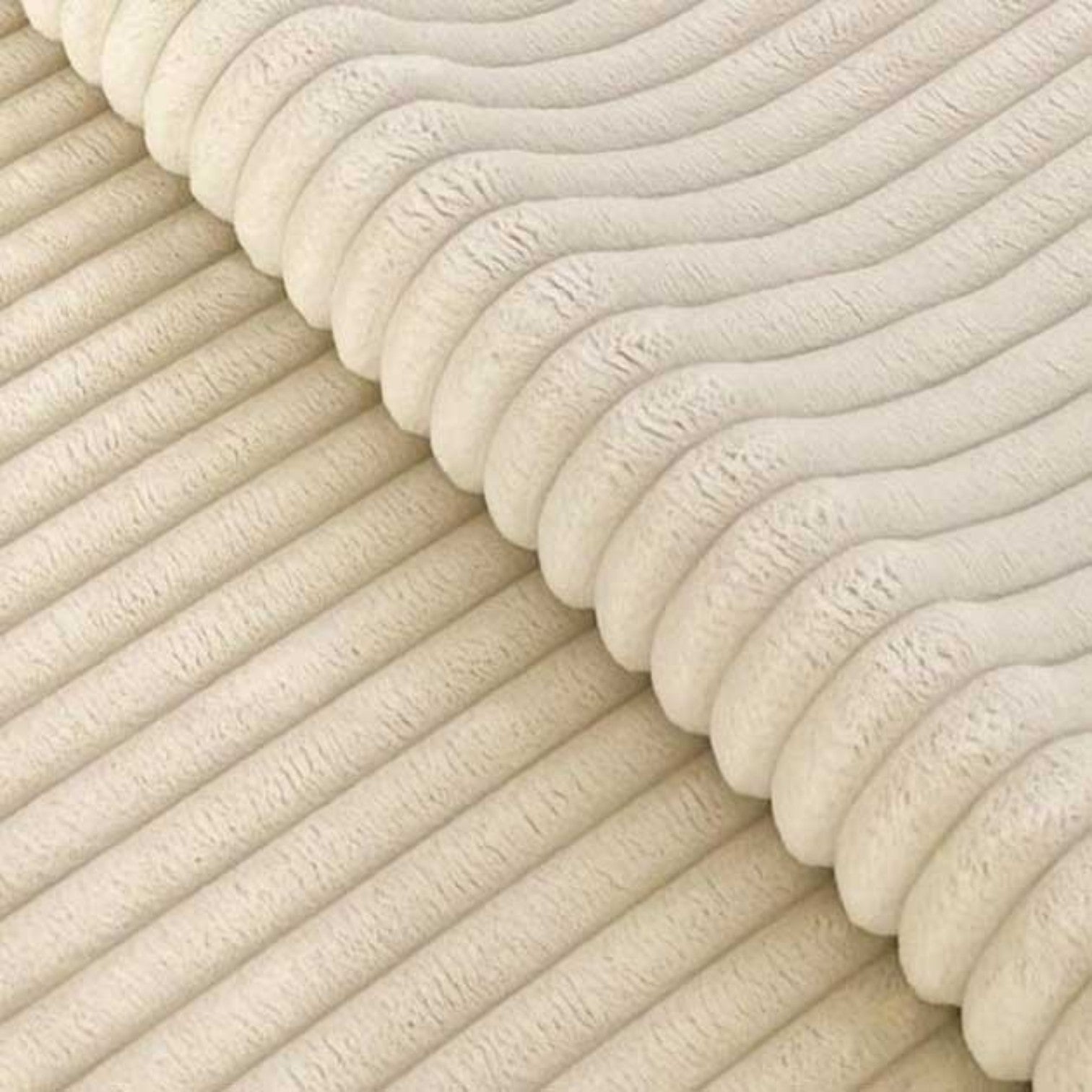 Sengen er trukket i ultra-mykt corduroy-stoff som er merket "pet-friendly". Stoffet tåler klør fra kjæledyr, er vannavstøtende og enkelt å rengjøre - perfekt for familier med dyr eller småbarn.