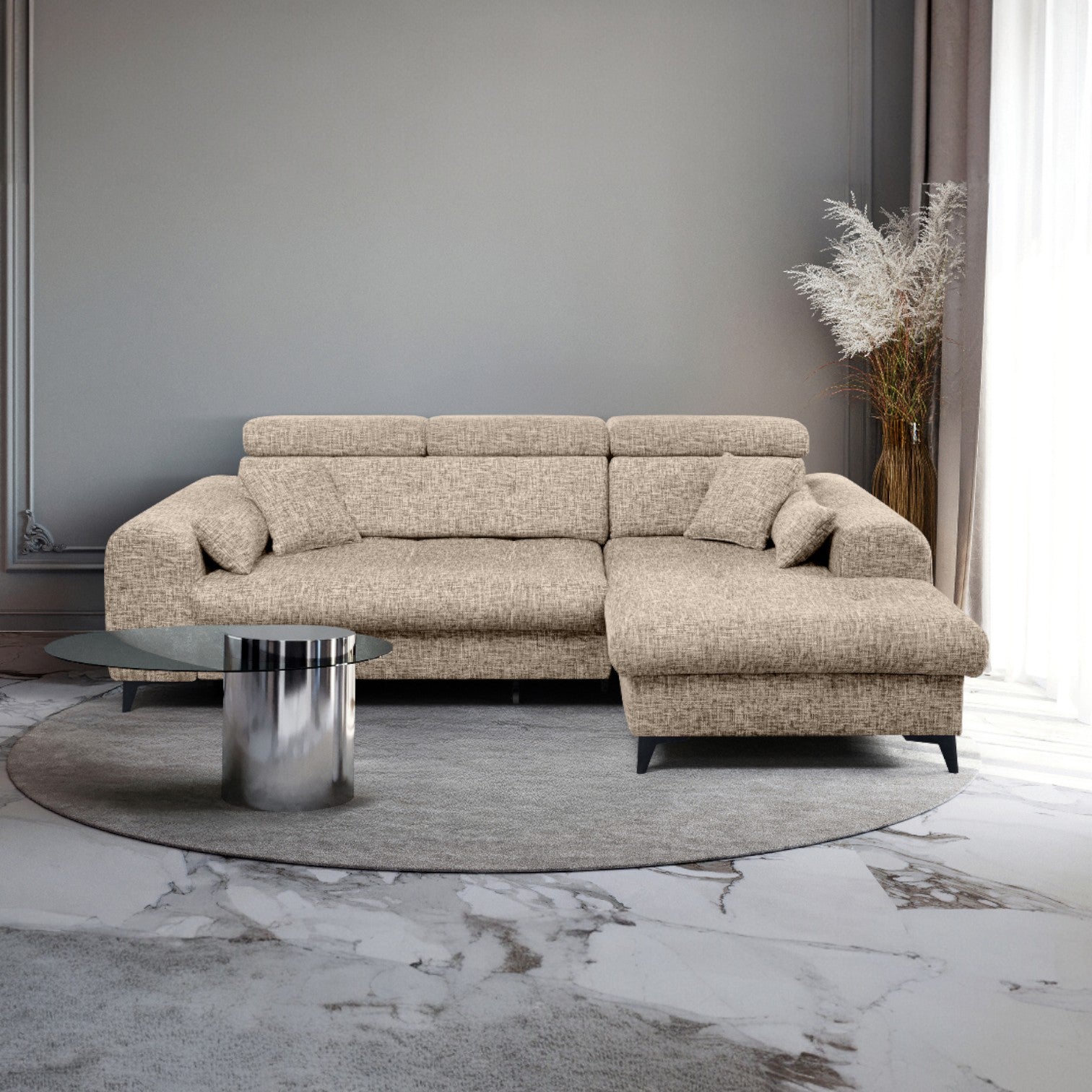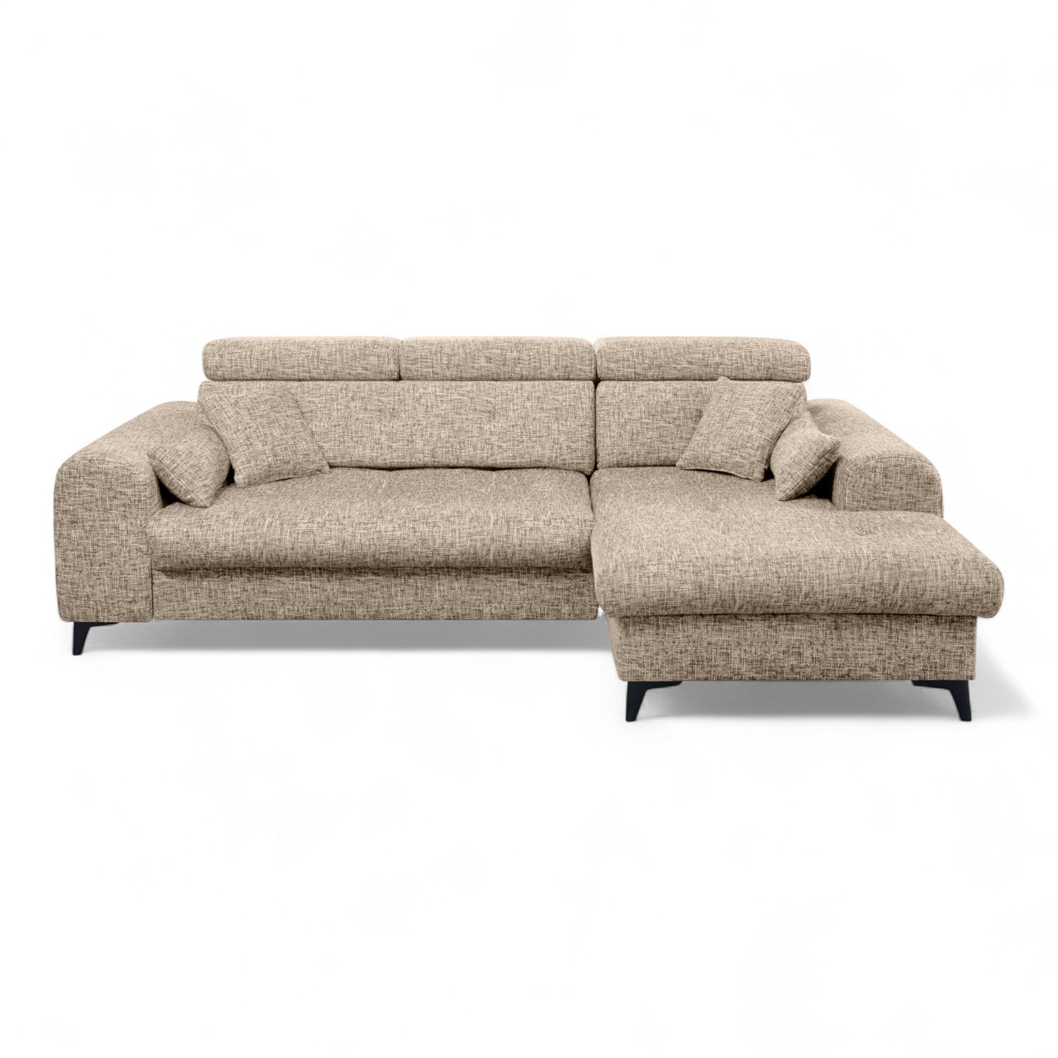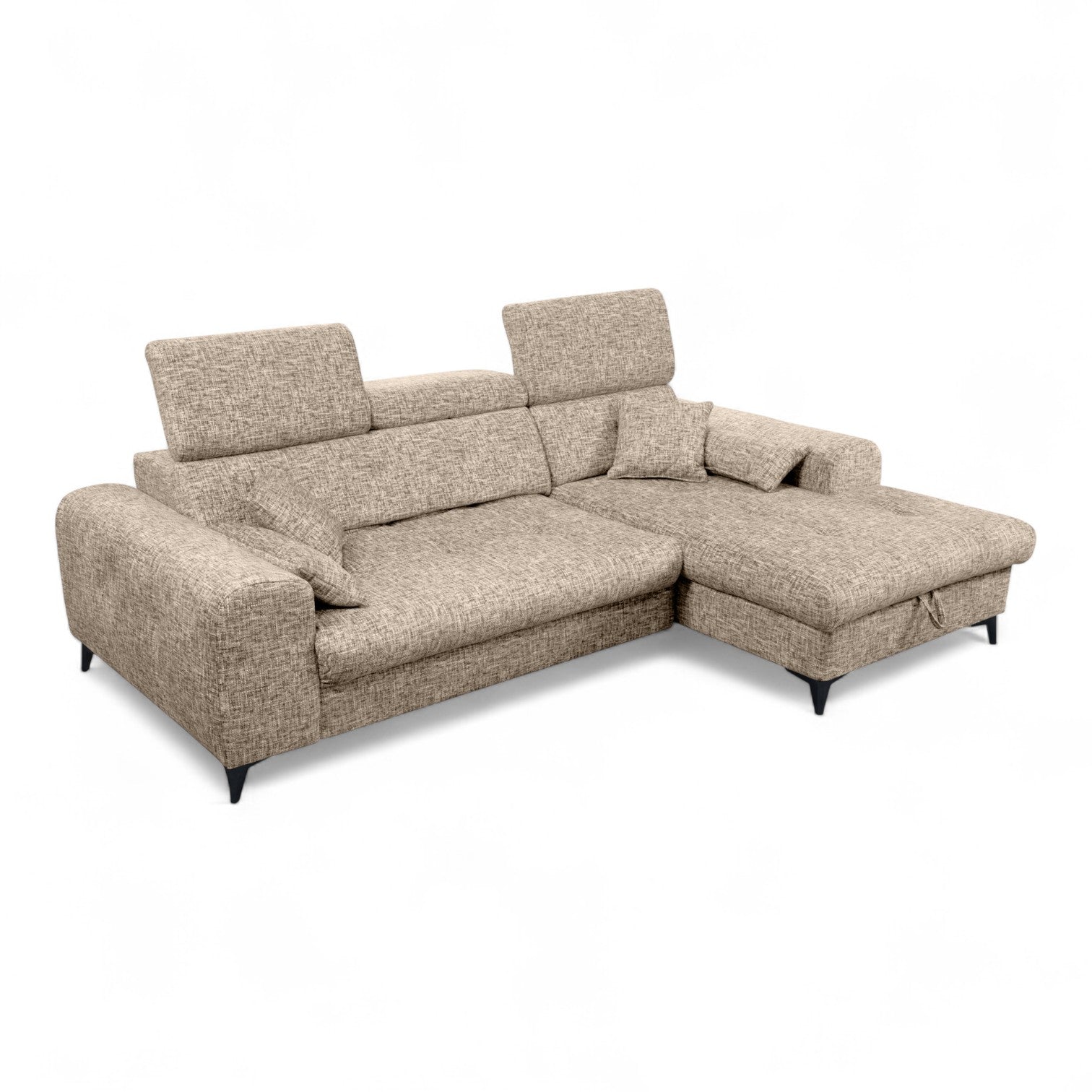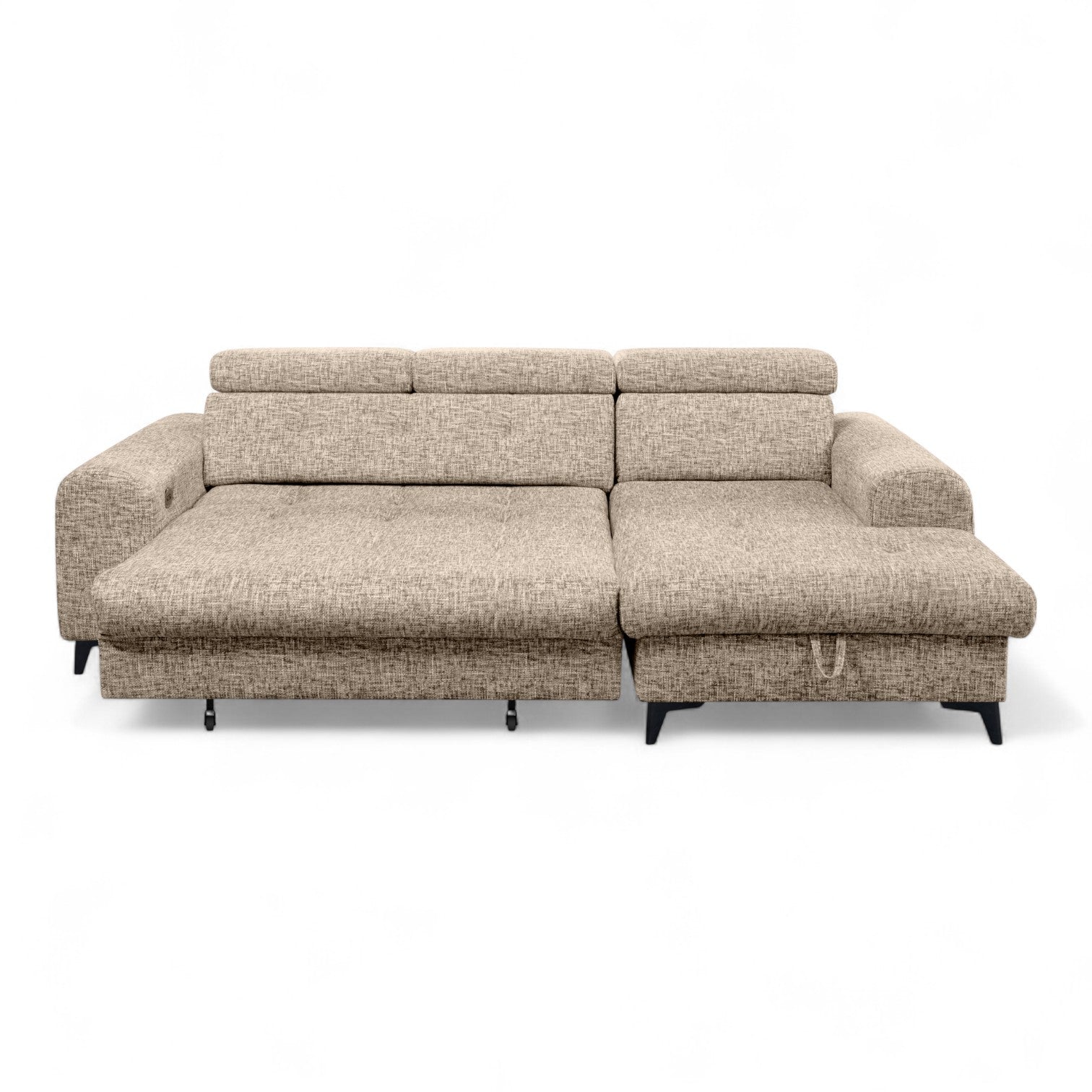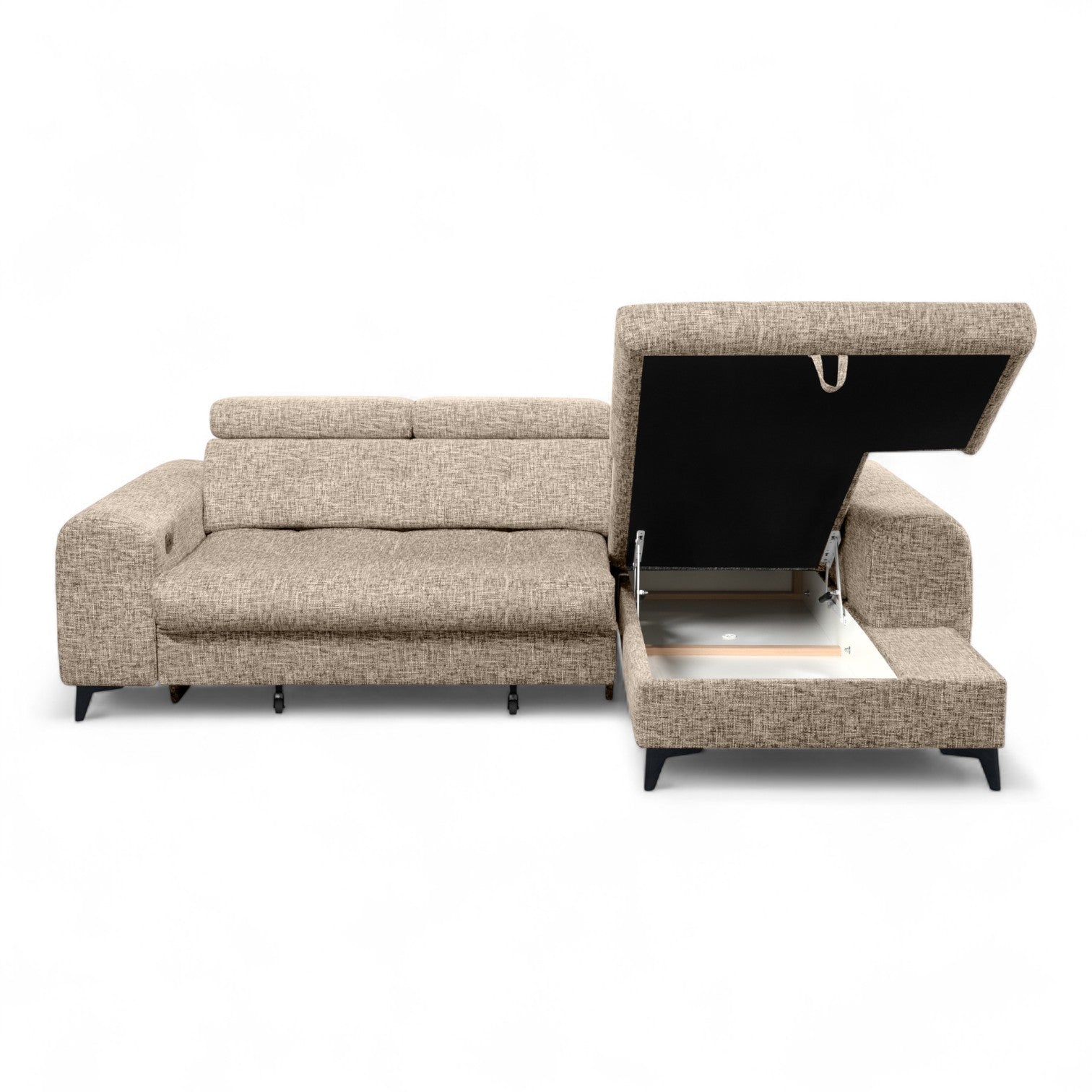 De individuelt justerbare nakkestøttene sørger for perfekt støtte enten du vil sitte oppreist eller lene deg tilbake, og et romslig oppbevaringsrom gir plass til puter, pledd eller sengetøy. De elegante metallbena gir sofaen et moderne uttrykk og stabil konstruksjon.