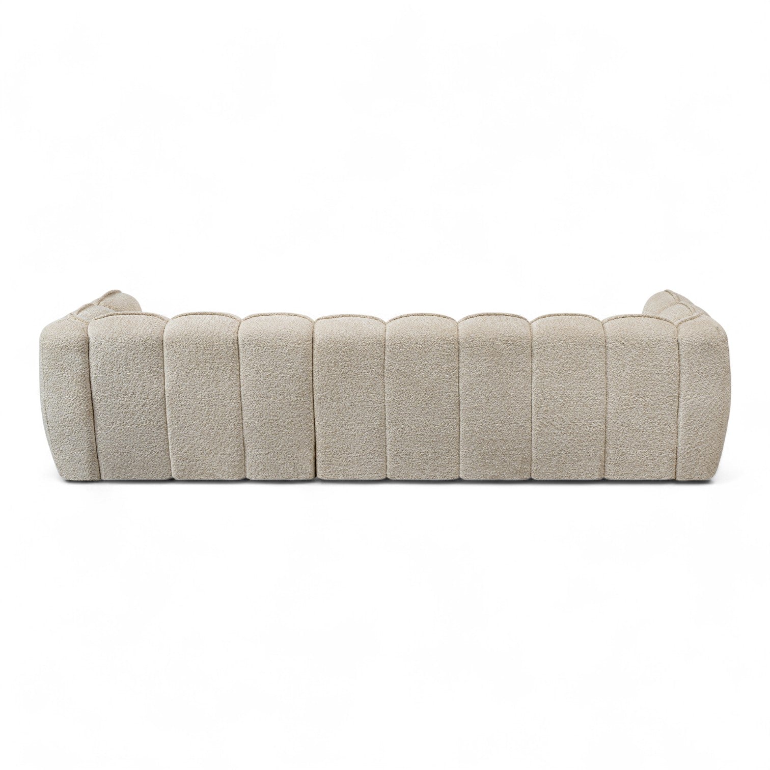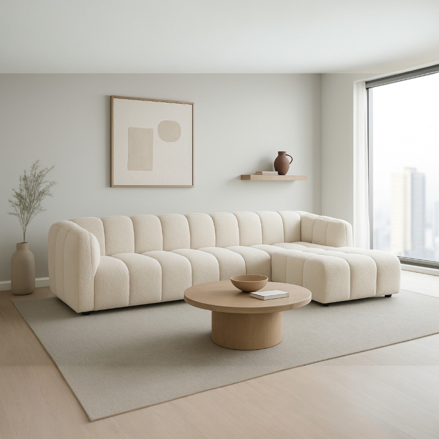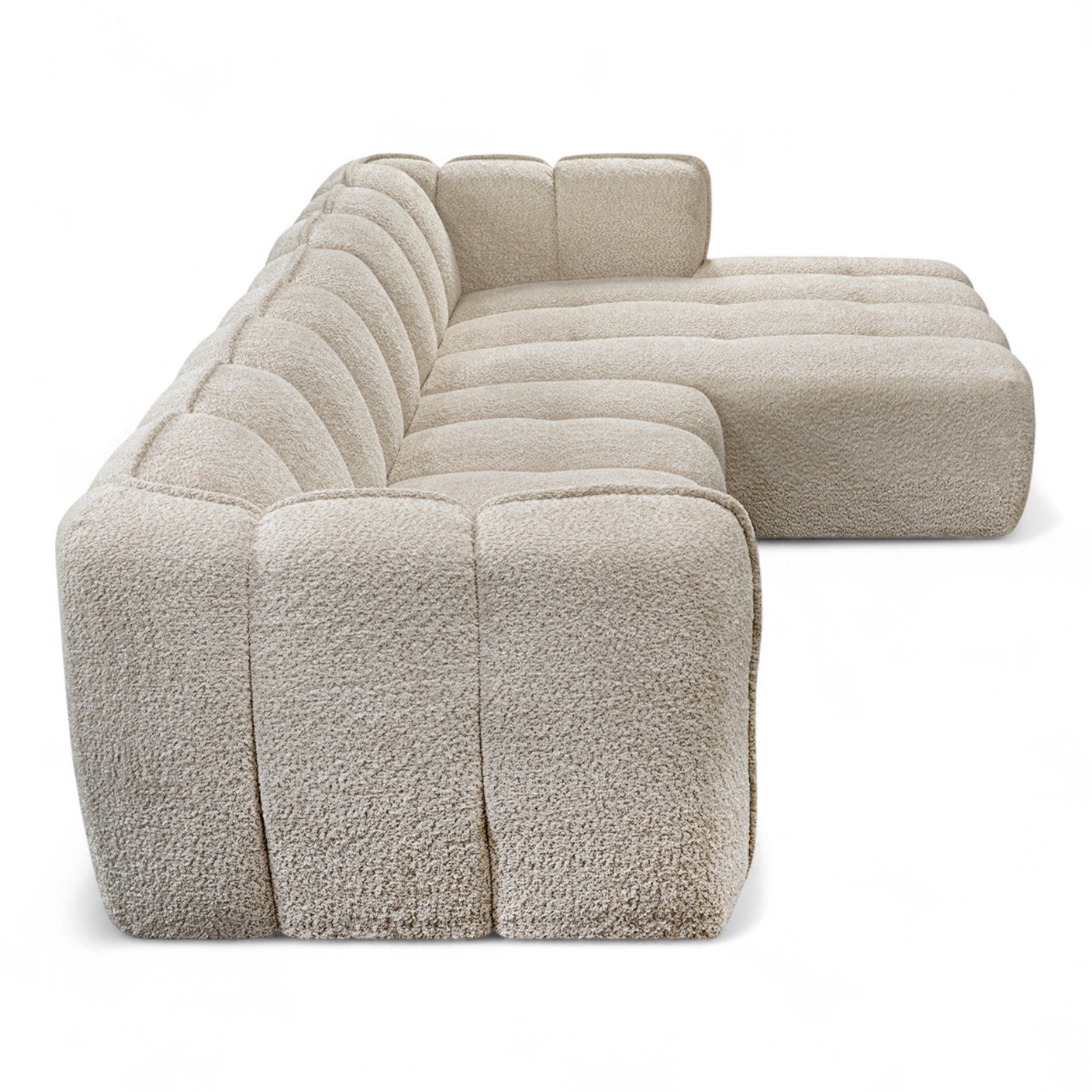 Sofa med sjeselong ELLA - Egon 26 er mer enn bare en sofa; det er et statement-møbel som kombinerer kunstnerisk design med enestående komfort. Med sitt unike formspråk, preget av myke, buede linjer, skaper den et organisk og innbydende midtpunkt i ethvert rom. Den er trukket i et mykt, teksturert bouclé-stoff som gir en sofistikert tekstur og et varmt preg.