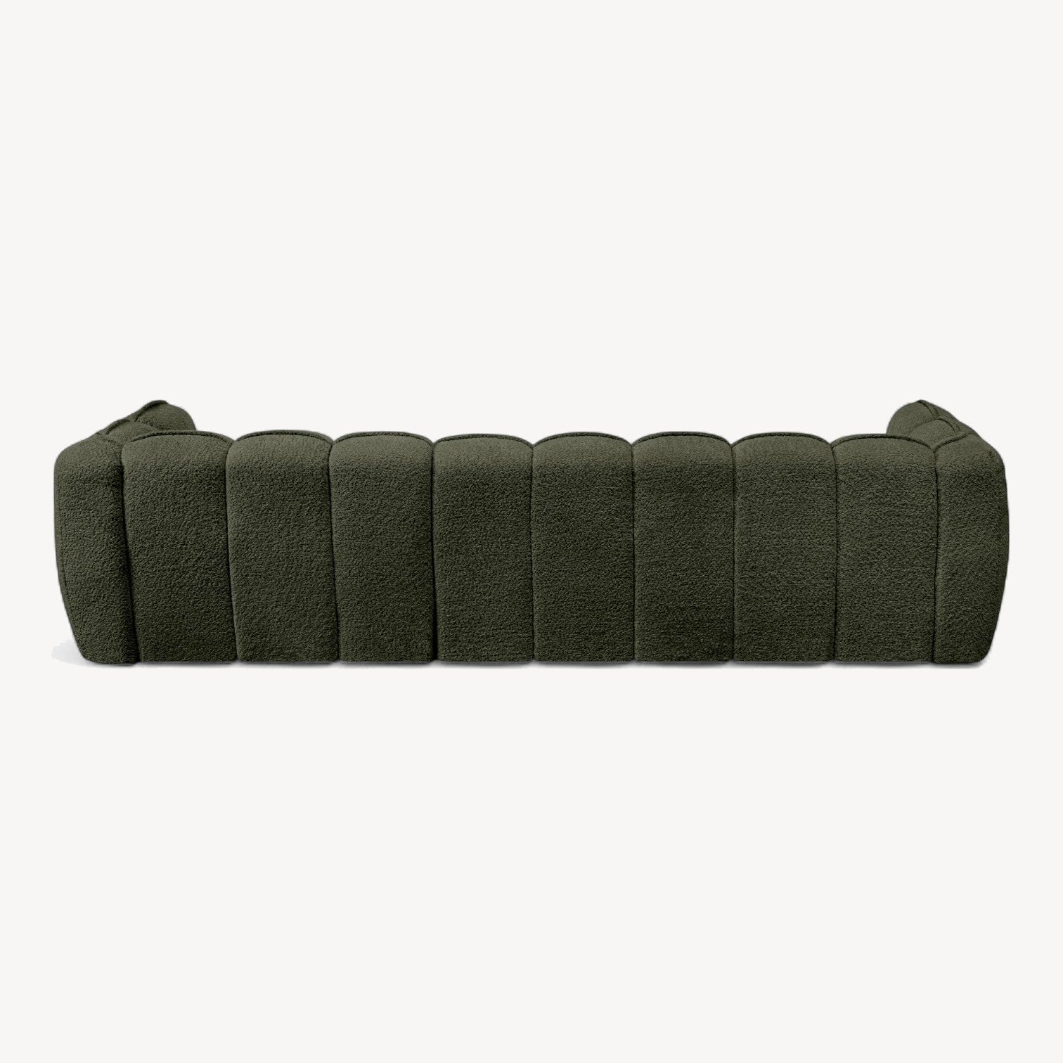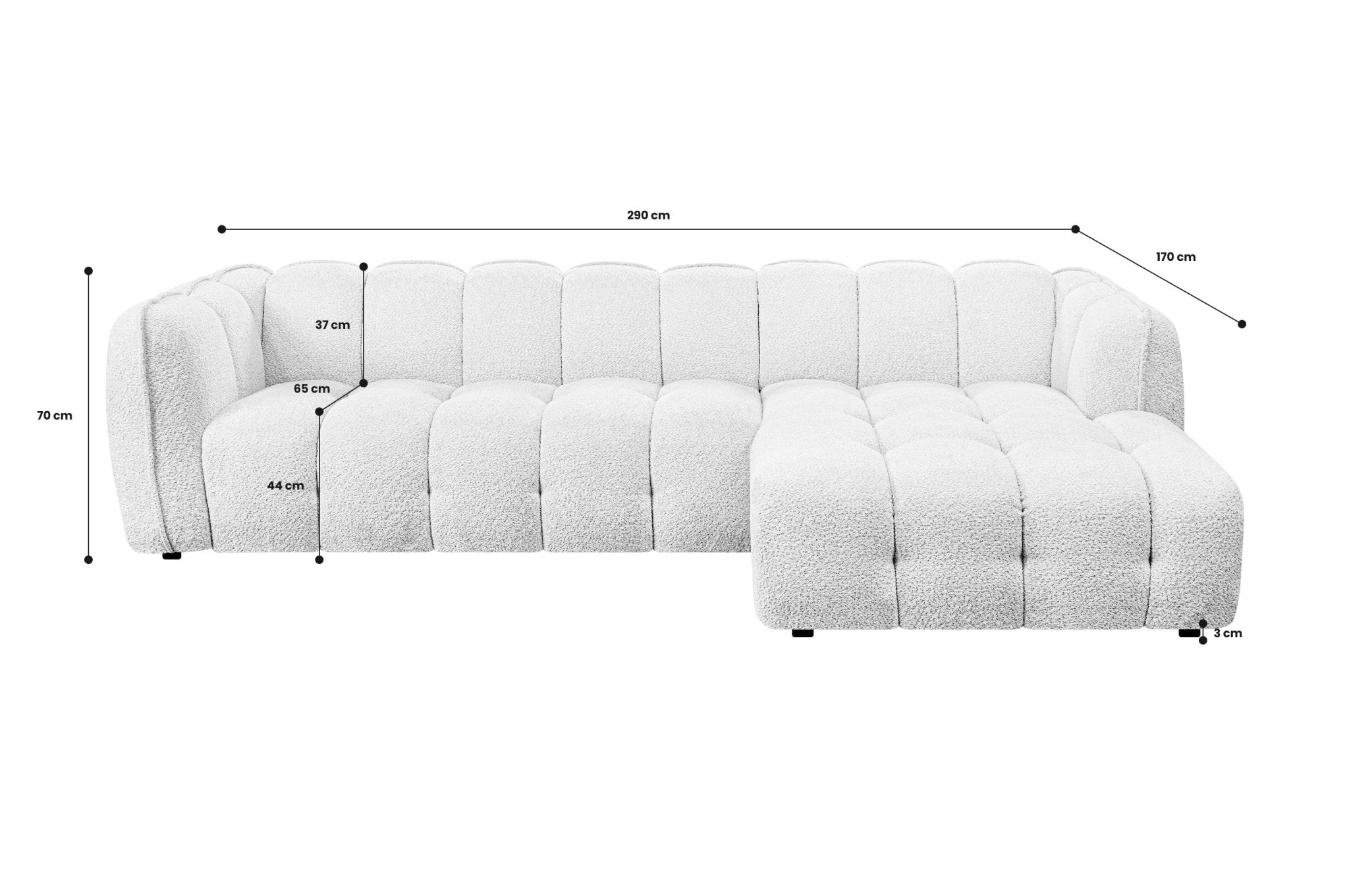 4-seters sofa med sjeselong ELLA i chenille grønn høyrevendt kombinerer stil og funksjonalitet med sitt unike puffede design og moderne uttrykk. Den er trukket i eksklusivt Dress Me chenille-stoff som er lett å rengjøre og vennlig for kjæledyr, samtidig som det gir en myk og behagelig sitteopplevelse.