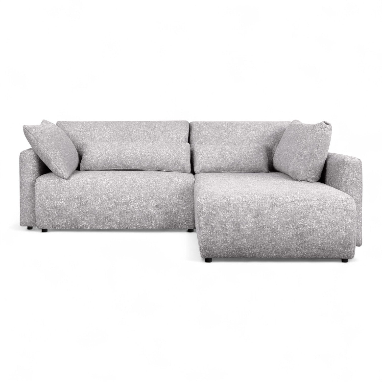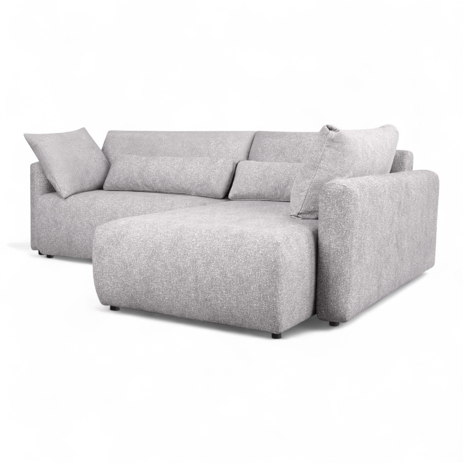 Smart fleksibilitet: Hjørneseksjonen kan monteres både på venstre eller høyre side, noe som gjør den ideell for ulike romløsninger. Ryggstøtten består av tre store puter, komplettert med tre dekorative spredeputer som sikrer både komfort og et harmonisk helhetsbilde.